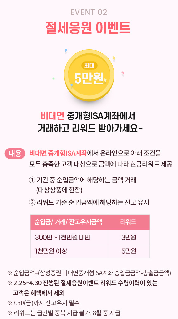 삼성증권은 중개형isa의 수수료가 평생무료고 아래와 같은 이벤트도 있어서 저는 삼성증권으로 진행중입니다.
