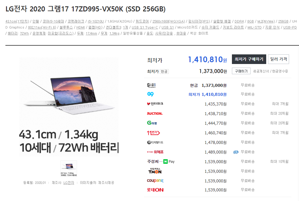 LG전자 2020 그램17 노트북 17ZD995-VX50K (i5-10210U 43.1cm)