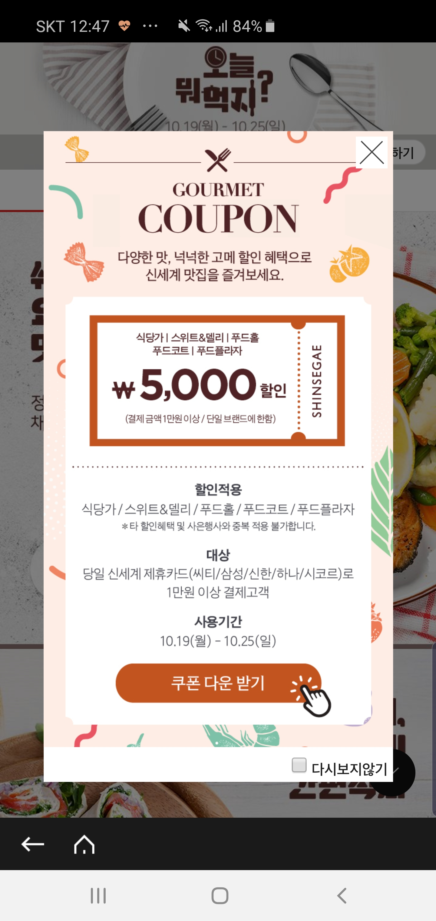 몇달째 계속 진행되고 있는 식당가 및 스위트&델리 푸드코트 10000만원이상 5000원 할인쿠폰입니다.