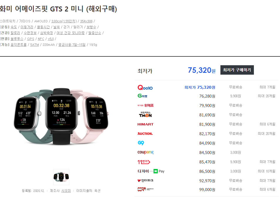 믿을 수 없는 쇼핑 찬스! AMAZFIT GTS 2 MINI (공식 한글판) / 최대 7일 대기가능 / 12가지 스포츠 모드 / 무료배송 / 대한민국 최저가 :시계 / 주얼리싱가폴, 일본, 한국, 미국 등 전 세계의 신상품, 최신